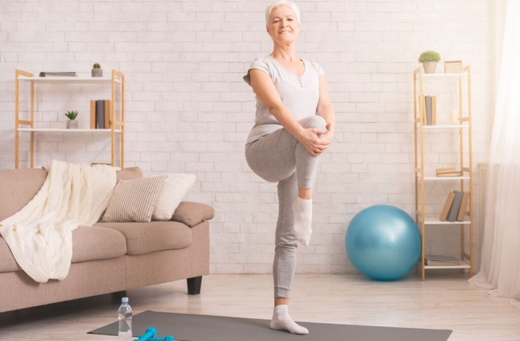 Start with 5 repetitions on each leg and gradually work up to 10. You can do this exercise while reading or watching your favorite show. The movement strengthens your quadriceps muscles, which help you stand up from chairs and walk with confidence.